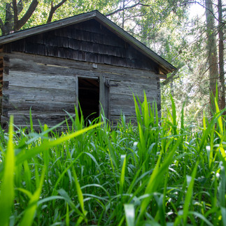 Surrounding the house, the overgrown yard encroaches on what remains, with tall grass and weeds reclaiming the space. The dense foliage of the trees above casts dappled shadows over the house, creating a stark contrast between light and darkness—a fitting metaphor for the life this house once knew and the decay that has taken its place.